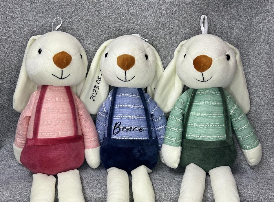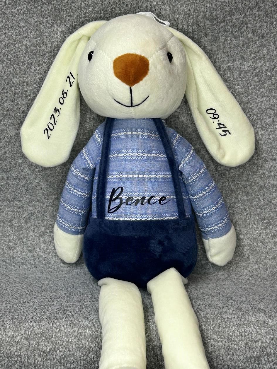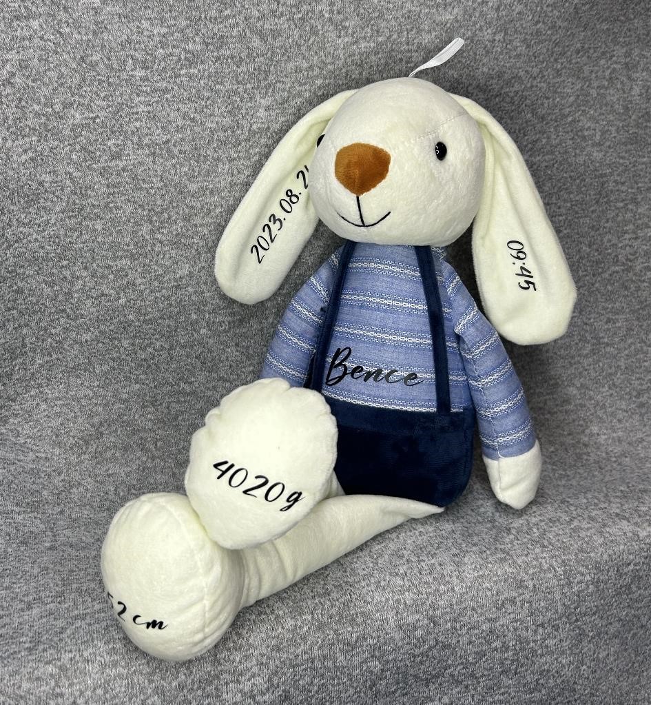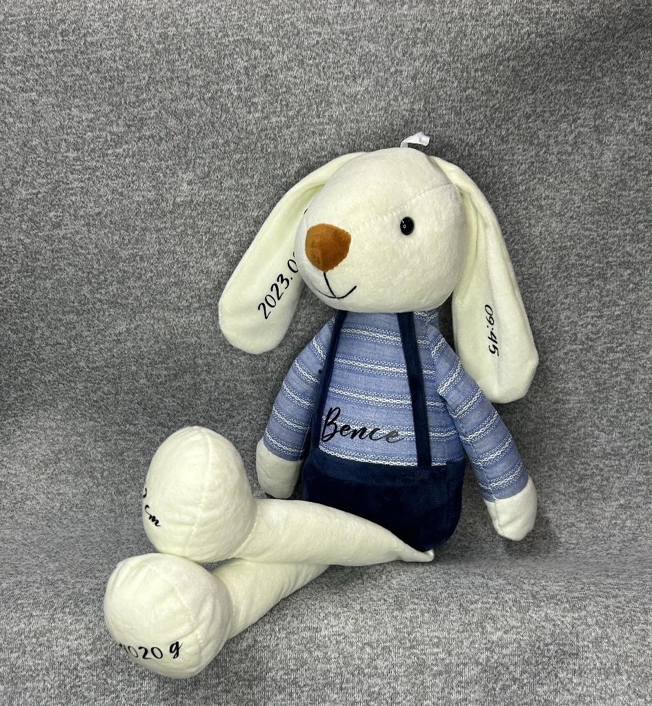 Emlékőr nyuszi, melyen a név a pocakján helyezkedik el, a születési adatok a fülén, a súly és a hossz a lábán helyezkedik el. Gyerekszoba éke vagy gyermeked legjobb társa lehet.