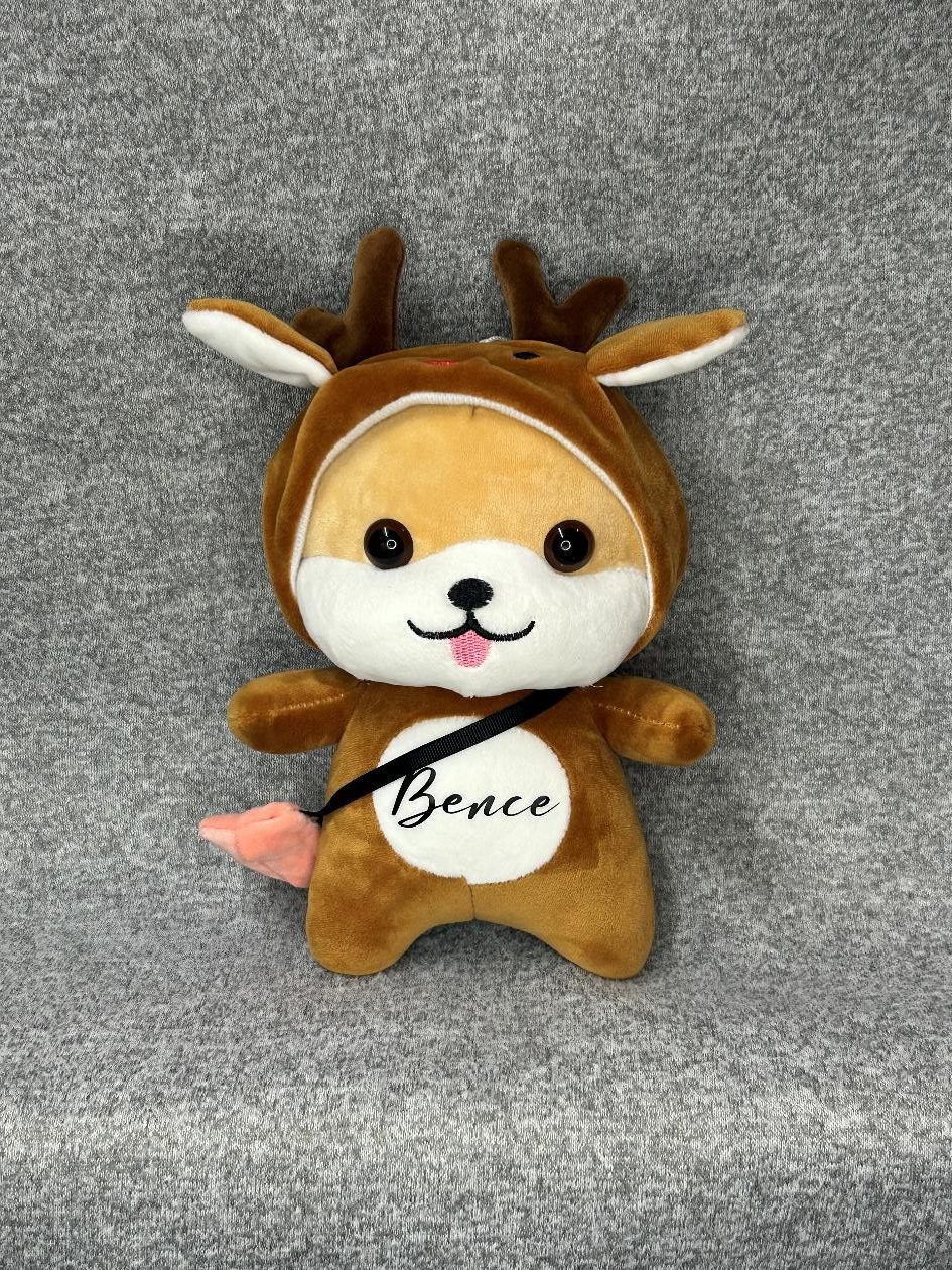 Névre szóló szarvas ruhás maci, melynek a pocakján helyezkedik el a felírat. Gyerekszoba éke vagy gyermeked legjobb társa lehet.