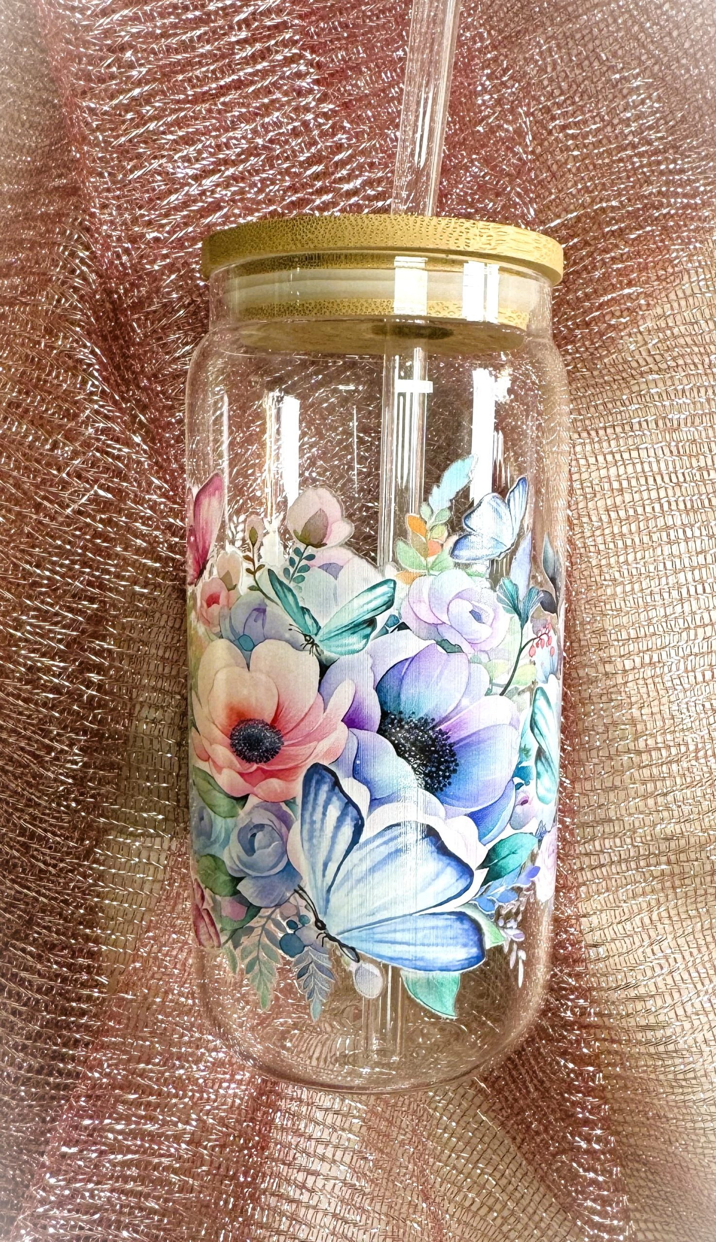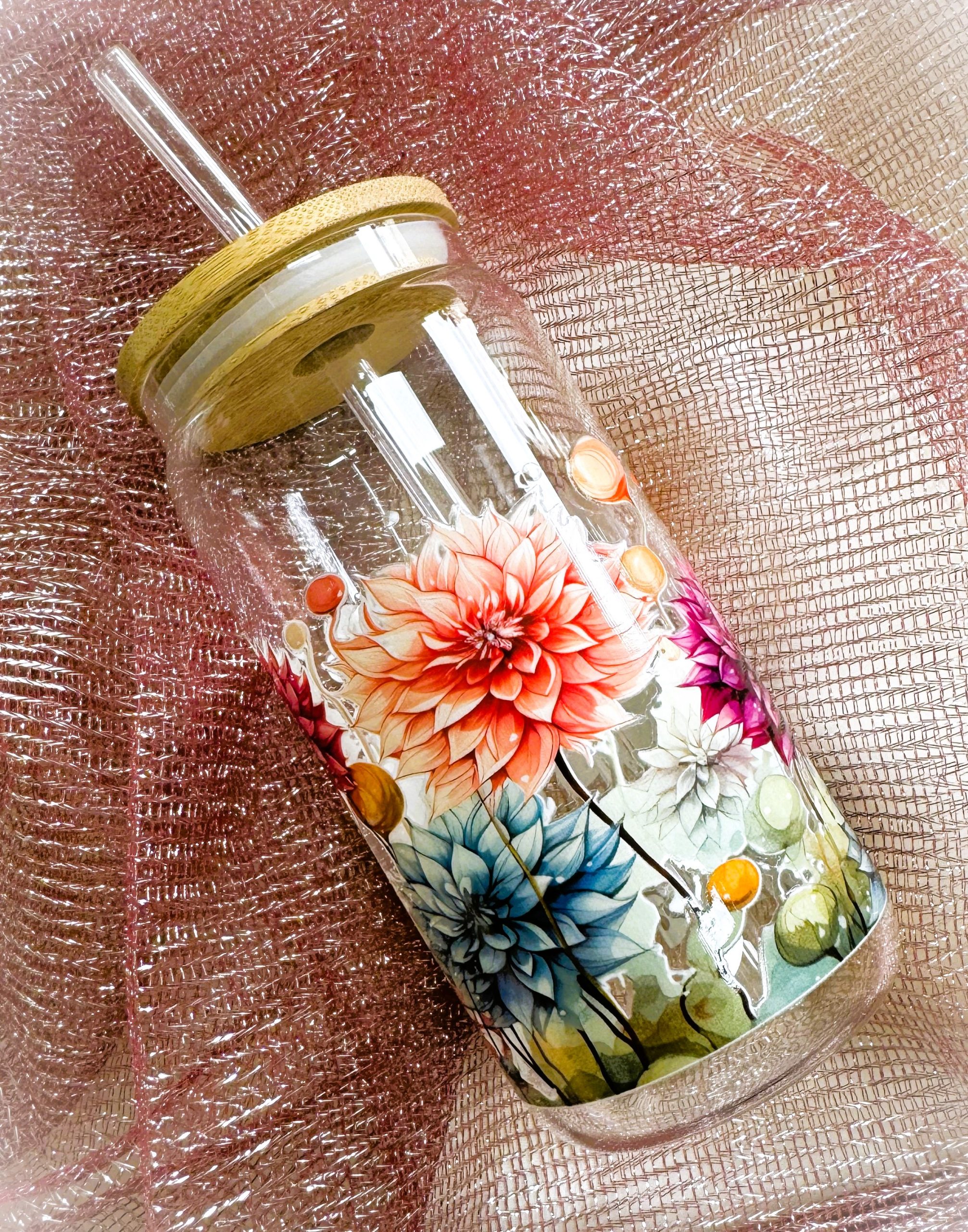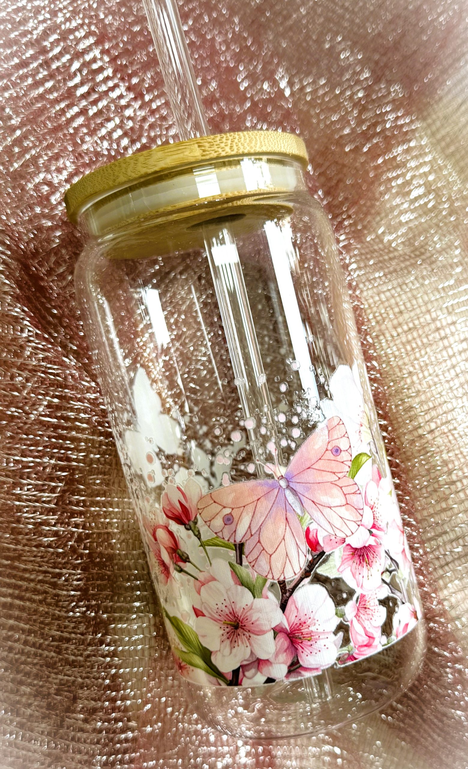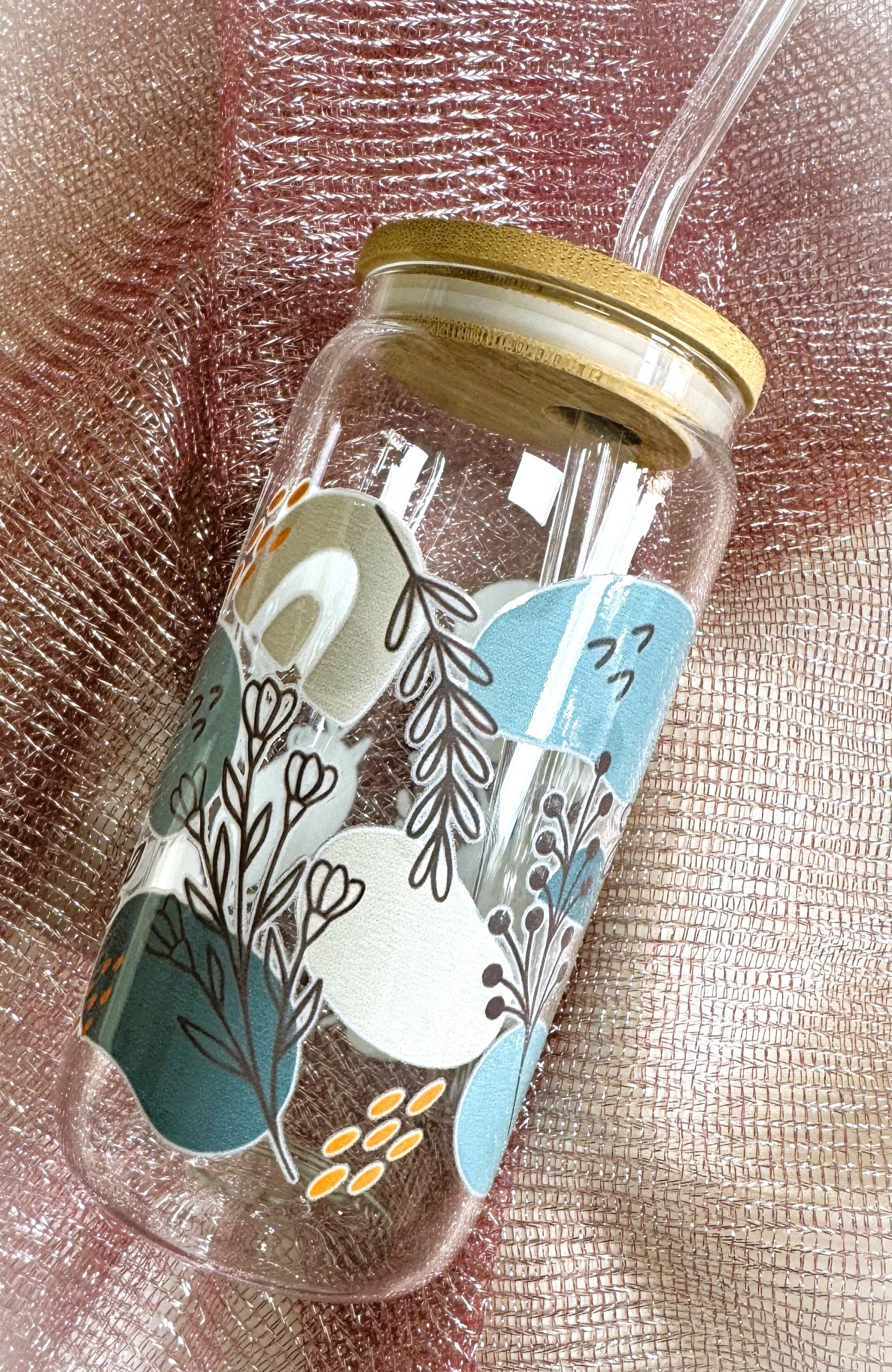 Üvegpohár bambusztetővel és üvegszívószállal.