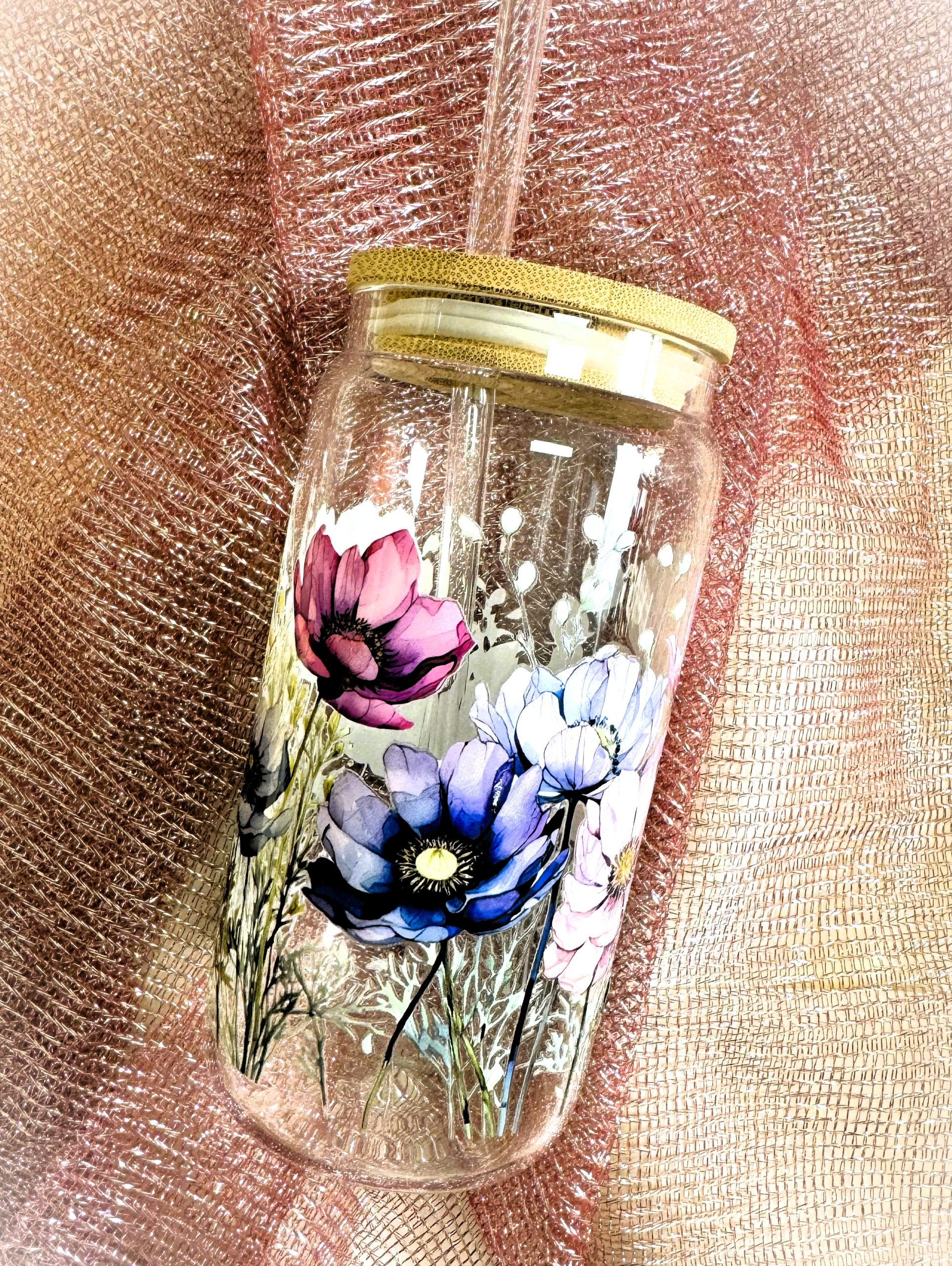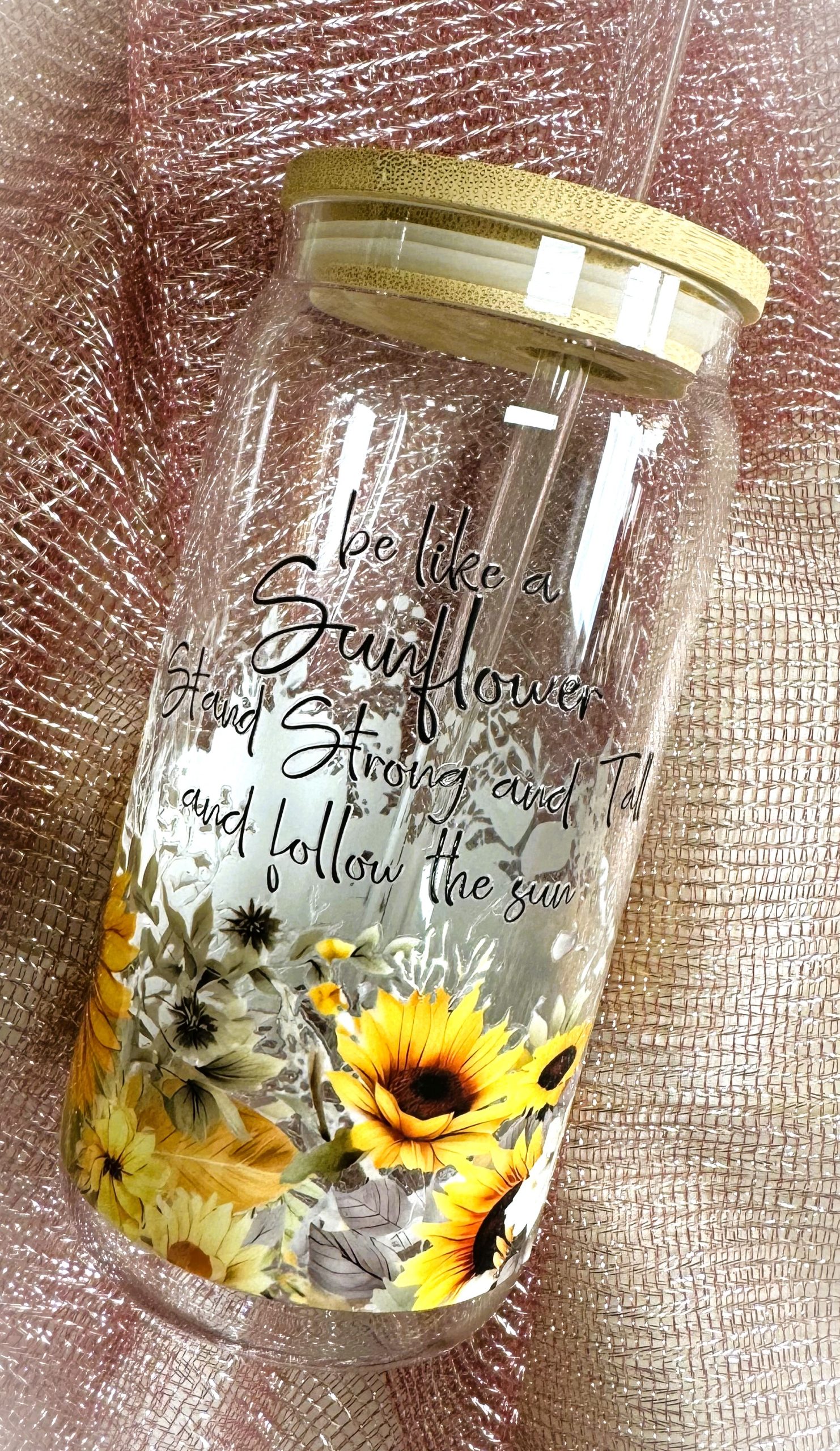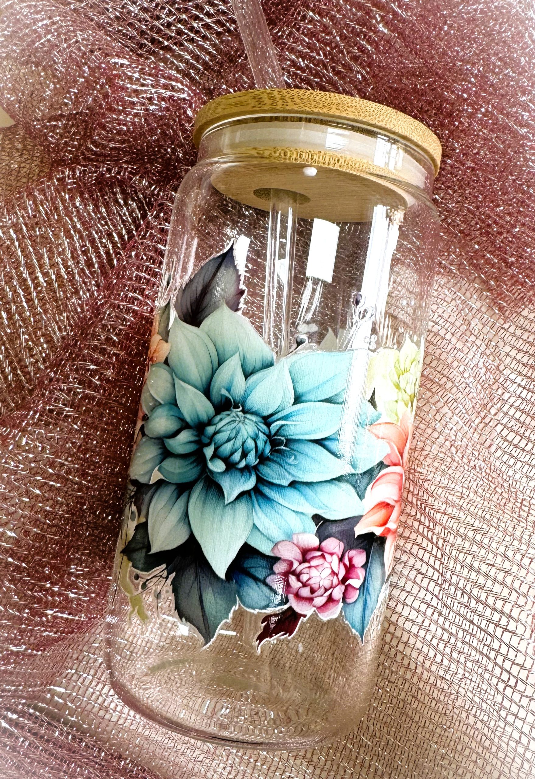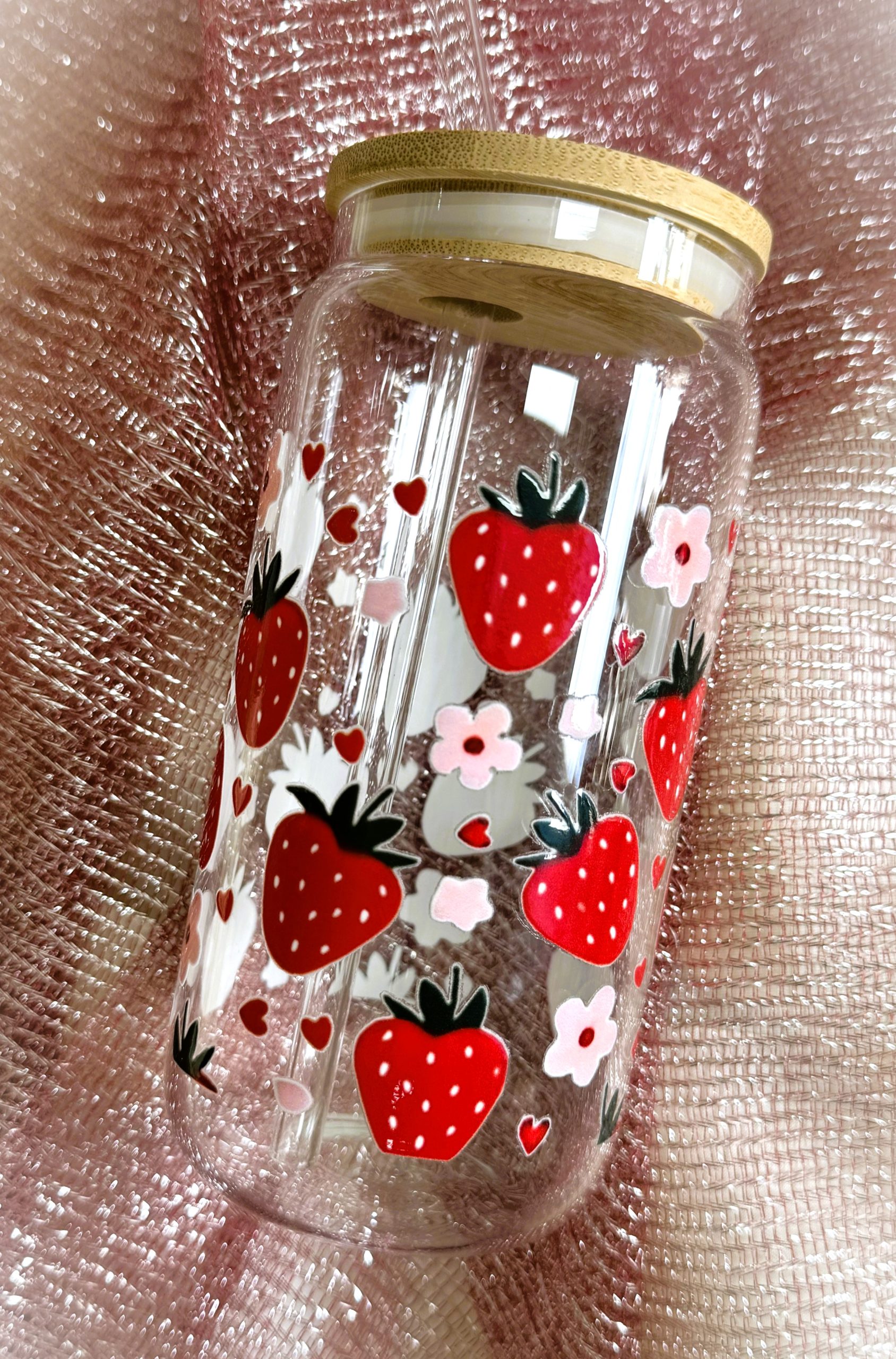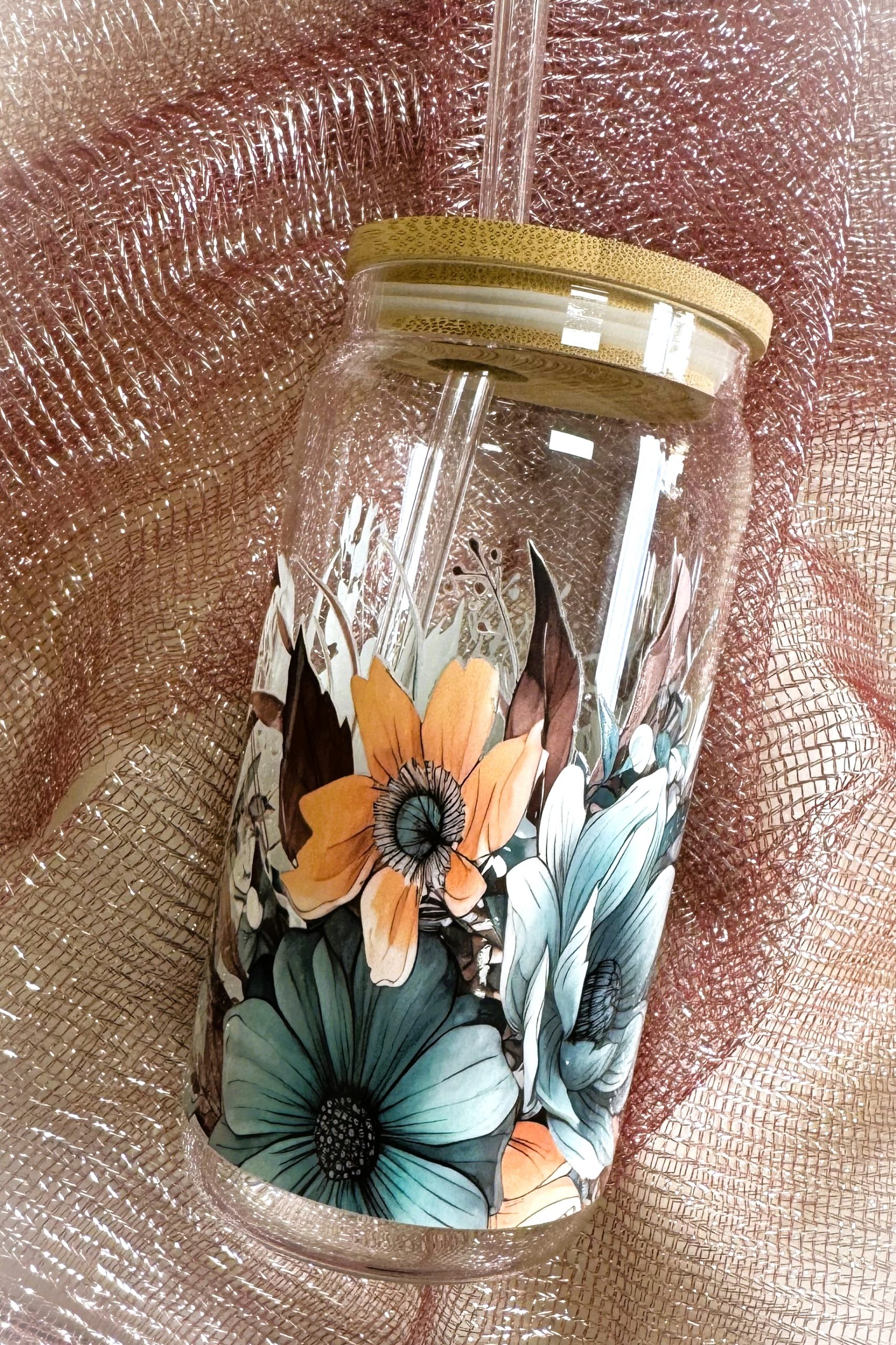 Üvegpohár bambusztetővel és üvegszívószállal.